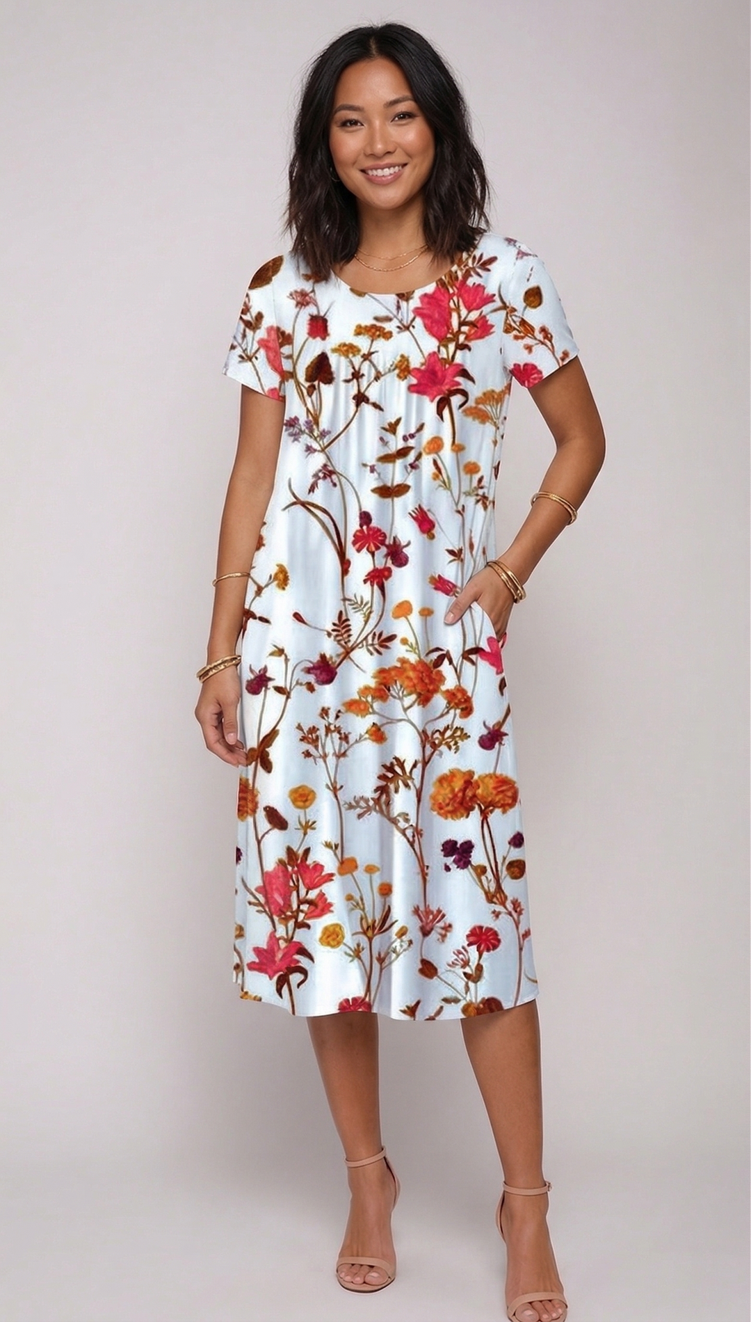 Women’s Floral Midi Dress With Round Neck And Short Sleeves
